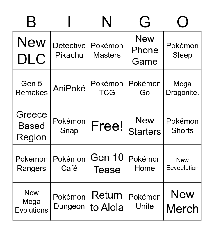 This bingo card has a free space and 24 words: Pokémon Café, Pokémon Dungeon, Pokémon TCG, New Mega Evolutions, Pokémon Sleep, New DLC, Gen 5 Remakes, Detective Pikachu, New Starters, Gen 10 Tease, Pokémon Go, Greece Based Region, Pokémon Home, New Eeveelution, AniPoké, Pokémon Unite, Pokémon Shorts, Pokémon Masters, Mega Dragonite., Pokémon Snap, New Merch, Pokémon Rangers, New Phone Game and Return to Alola.