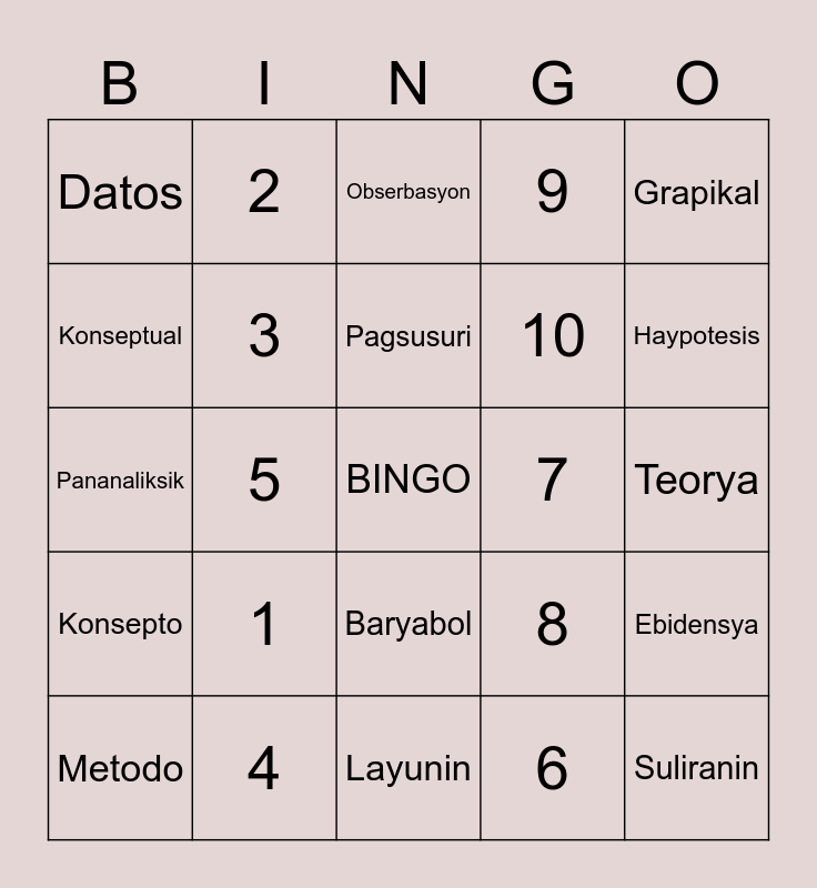 This bingo card has a free space and 24 words: Metodo, 1, Pagsusuri, 6, Grapikal, Datos, 2, Obserbasyon, 7, Teorya, Pananaliksik, 3, 8, Ebidensya, Konseptual, 4, Layunin, 9, Haypotesis, Konsepto, 5, Baryabol, 10 and Suliranin.