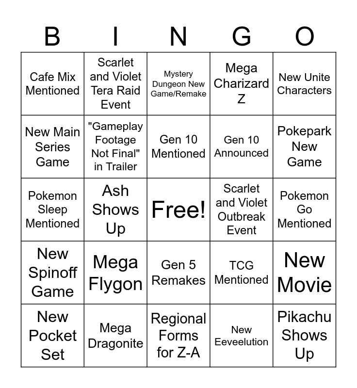 This bingo card has a free space and 24 words: Mega Flygon, Mega Dragonite, Gen 10 Mentioned, New Pocket Set, New Unite Characters, Cafe Mix Mentioned, New Main Series Game, Scarlet and Violet Tera Raid Event, Scarlet and Violet Outbreak Event, Gen 5 Remakes, Gen 10 Announced, Pokemon Sleep Mentioned, TCG Mentioned, New Movie, "Gameplay Footage Not Final" in Trailer, New Eeveelution, Pokemon Go Mentioned, Mystery Dungeon New Game/Remake, Pokepark New Game, Ash Shows Up, Pikachu Shows Up, New Spinoff Game, Mega Charizard Z and Regional Forms for Z-A.