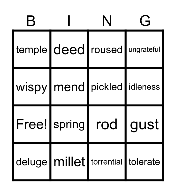 This bingo card has 20 words: gust, trudge, roused, uproot, deluge, wispy, millet, temple, Free!, deed, spring, rod, mend, tolerate, pickled, exhausted, idleness, ungrateful, torrential and to strike.