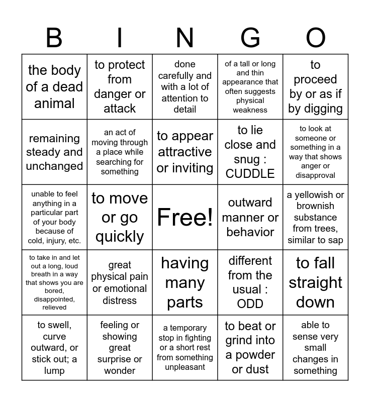 This bingo card has a free space and 24 words: great physical pain or emotional distress, feeling or showing great surprise or wonder, to appear attractive or inviting, to swell, curve outward, or stick out; a lump, to proceed by or as if by digging, the body of a dead animal, remaining steady and unchanged, to protect from danger or attack, outward manner or behavior, having many parts, to lie close and snug : CUDDLE, unable to feel anything in a particular part of your body because of cold, injury, etc., different from the usual : ODD, to fall straight down, an act of moving through a place while searching for something, to beat or grind into a powder or dust, a yellowish or brownish substance from trees, similar to sap, done carefully and with a lot of attention to detail, to look at someone or something in a way that shows anger or disapproval, to move or go quickly, able to sense very small changes in something, to take in and let out a long, loud breath in a way that shows you are bored, disappointed, relieved, of a tall or long and thin appearance that often suggests physical weakness and a temporary stop in fighting or a short rest from something unpleasant.