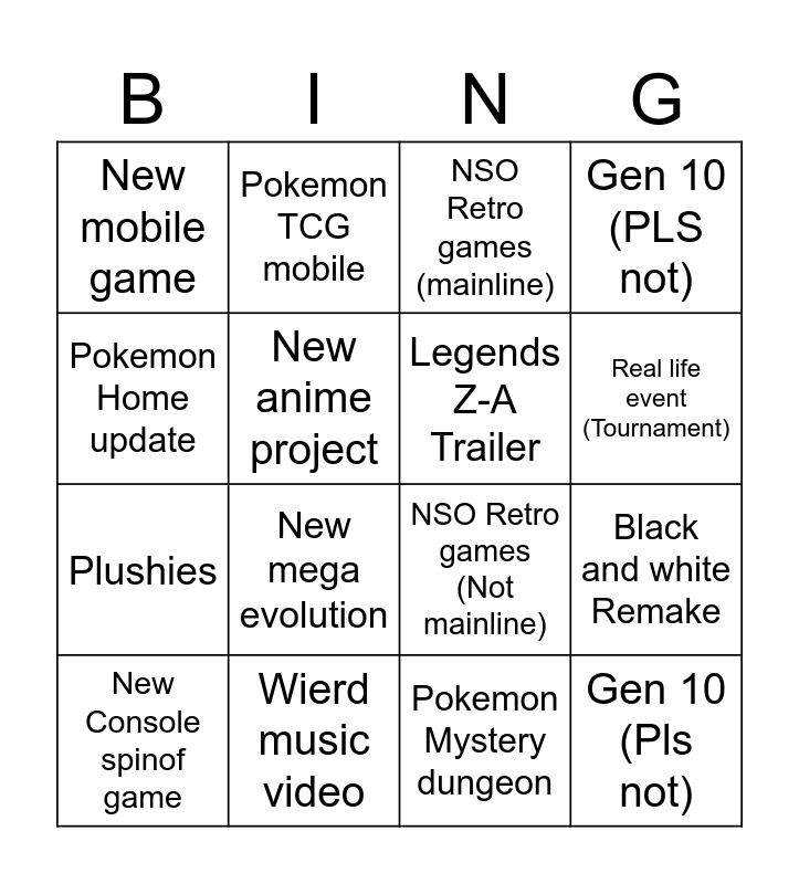 This bingo card has 17 words: Pokemon Mystery dungeon, New Console spinof game, NSO Retro games (mainline), New mobile game, New mega evolution, Gen 10 (PLS not), Black and white Remake, Legends Z-A Trailer, Real life event (Tournament), New anime project, Wierd music video, NSO Retro games (Not mainline), Pokemon Home update, Pokemon TCG mobile, Plushies, No mention of Switch2 and Gen 10 (Pls not).