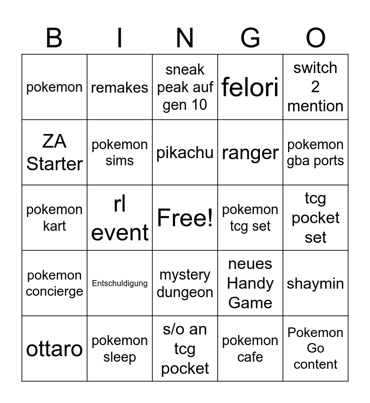 This bingo card has a free space and 24 words: Entschuldigung, pokemon sleep, pikachu, ottaro, switch 2 mention, pokemon, ZA Starter, remakes, pokemon tcg set, mystery dungeon, ranger, pokemon kart, neues Handy Game, shaymin, pokemon sims, pokemon cafe, tcg pocket set, sneak peak auf gen 10, pokemon gba ports, rl event, Pokemon Go content, pokemon concierge, felori and s/o an tcg pocket.