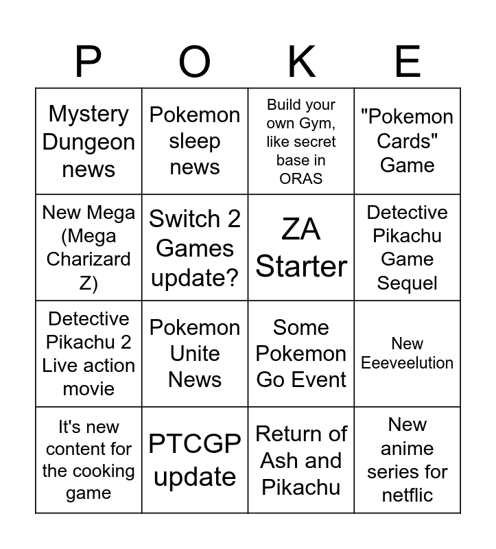 This bingo card has 16 words: PTCGP update, New Eeeveelution, Build your own Gym, like secret base in ORAS, Mystery Dungeon news, Detective Pikachu 2 Live action movie, Pokemon sleep news, Some Pokemon Go Event, Return of Ash and Pikachu, New Mega (Mega Charizard Z), Switch 2 Games update?, It's new content for the cooking game, "Pokemon Cards" Game, Pokemon Unite News, Detective Pikachu Game Sequel, ZA Starter and New anime series for netflic.