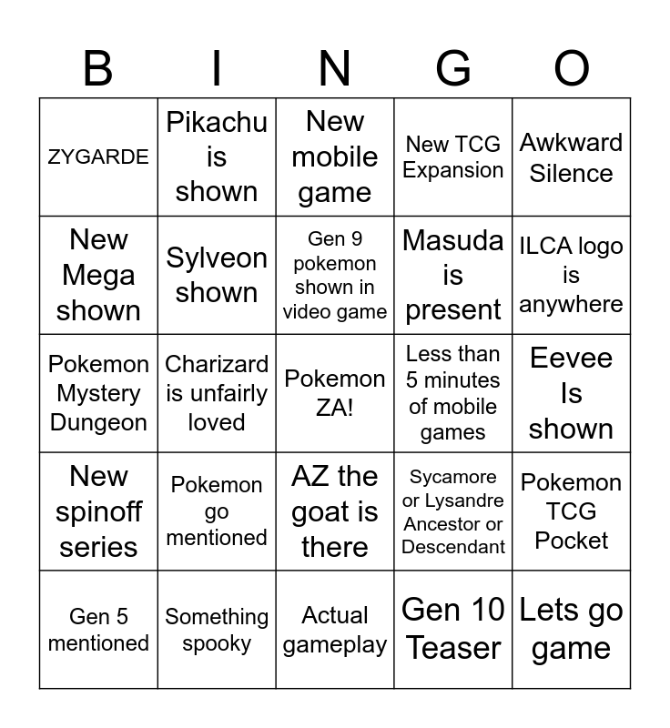 This bingo card has a free space and 26 words: AZ the goat is there, Gen 10 Teaser, Gen 9 pokemon shown in video game, Something spooky, Awkward Silence, ZYGARDE, New Mega shown, Pikachu is shown, Eevee Is shown, Sycamore or Lysandre Ancestor or Descendant, Masuda is present, Pokemon Mystery Dungeon, Pokemon TCG Pocket, Gen 5 mentioned, Charizard is unfairly loved, Pokemon Unite character, New TCG Expansion, New spinoff series, New mobile game, Lets go game, ILCA logo is anywhere, Actual gameplay, Less than 5 minutes of mobile games, Pokemon go mentioned, Sylveon shown and Ugly textures.