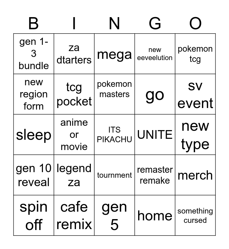 This bingo card has a free space and 24 words: legend za, cafe remix, pokemon masters, spin off, pokemon tcg, gen 1-3 bundle, new region form, za dtarters, UNITE, tournment, go, sleep, remaster remake, merch, tcg pocket, home, new type, mega, sv event, anime or movie, something cursed, gen 10 reveal, new eeveelution and gen 5.