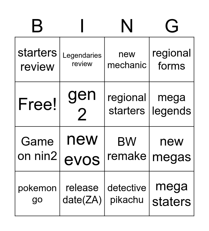 This bingo card has 16 words: release date(ZA), new megas, new mechanic, starters review, Game on nin2, Legendaries review, BW remake, detective pikachu, Free!, gen 2, pokemon go, regional forms, new evos, mega legends, regional starters and mega staters.