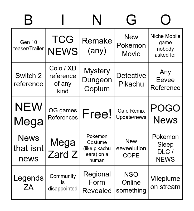 This bingo card has a free space and 24 words: Mega Zard Z, Community is disappointed, Mystery Dungeon Copium, Legends ZA, Niche Mobile game nobody asked for, Gen 10 teaser/Trailer, Switch 2 reference, TCG NEWS, Cafe Remix Update/news, Pokemon Costume (like pikachu ears) on a human, Detective Pikachu, NEW Mega, New eeveelution COPE, Pokemon Sleep DLC / NEWS, Colo / XD reference of any kind, NSO Online something, POGO News, Remake (any), Any Eevee Reference, OG games References, Vileplume on stream, News that isnt news, New Pokemon Movie and Regional Form Revealed.