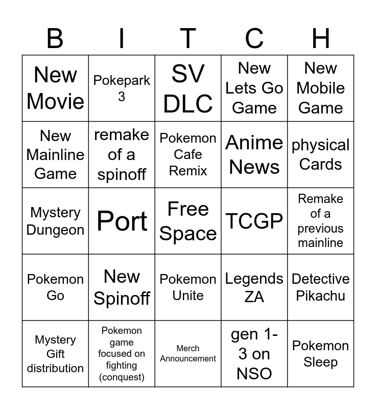 This bingo card has a free space and 24 words: New Spinoff, Pokemon game focused on fighting (conquest), Pokemon Cafe Remix, Mystery Gift distribution, New Mobile Game, New Movie, New Mainline Game, Pokepark 3, TCGP, Pokemon Unite, Anime News, Mystery Dungeon, Legends ZA, Detective Pikachu, remake of a spinoff, gen 1-3 on NSO, Remake of a previous mainline, SV DLC, physical Cards, Port, Pokemon Sleep, Pokemon Go, New Lets Go Game and Merch Announcement.