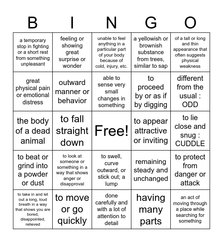 This bingo card has a free space and 24 words: to look at someone or something in a way that shows anger or disapproval, to move or go quickly, able to sense very small changes in something, to take in and let out a long, loud breath in a way that shows you are bored, disappointed, relieved, of a tall or long and thin appearance that often suggests physical weakness, a temporary stop in fighting or a short rest from something unpleasant, great physical pain or emotional distress, feeling or showing great surprise or wonder, to appear attractive or inviting, to swell, curve outward, or stick out; a lump, to proceed by or as if by digging, the body of a dead animal, remaining steady and unchanged, to protect from danger or attack, outward manner or behavior, having many parts, to lie close and snug : CUDDLE, unable to feel anything in a particular part of your body because of cold, injury, etc., different from the usual : ODD, to fall straight down, an act of moving through a place while searching for something, to beat or grind into a powder or dust, a yellowish or brownish substance from trees, similar to sap and done carefully and with a lot of attention to detail.