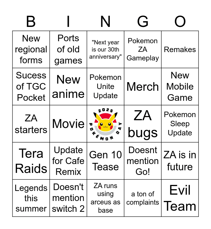 This bingo card has a free space and 24 words: Update for Cafe Remix, Doesn't mention switch 2, Pokemon Unite Update, Legends this summer, Remakes, New regional forms, Sucess of TGC Pocket, Ports of old games, ZA bugs, Gen 10 Tease, Merch, ZA starters, Doesnt mention Go!, ZA is in future, New anime, a ton of complaints, Pokemon Sleep Update, "Next year is our 30th anniversary", New Mobile Game, Movie, Evil Team, Tera Raids, Pokemon ZA Gameplay and ZA runs using arceus as base.
