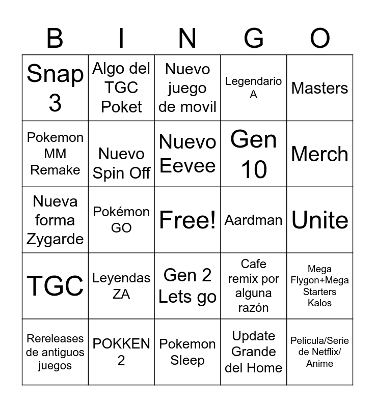 This bingo card has a free space and 24 words: Leyendas ZA, POKKEN 2, Nuevo Eevee, Rereleases de antiguos juegos, Masters, Snap 3, Pokemon MM Remake, Algo del TGC Poket, Aardman, Gen 2 Lets go, Gen 10, Nueva forma Zygarde, Cafe remix por alguna razón, Mega Flygon+Mega Starters Kalos, Nuevo Spin Off, Update Grande del Home, Unite, Nuevo juego de movil, Merch, Pokémon GO, Pelicula/Serie de Netflix/ Anime, TGC, Legendario A and Pokemon Sleep.