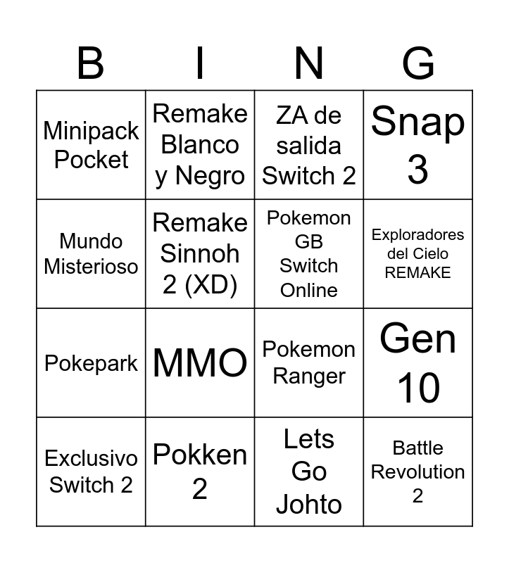 This bingo card has 16 words: Pokken 2, Gen 10, ZA de salida Switch 2, Minipack Pocket, Pokepark, Remake Blanco y Negro, Pokemon Ranger, Lets Go Johto, Mundo Misterioso, Remake Sinnoh 2 (XD), Exclusivo Switch 2, Snap 3, MMO, Exploradores del Cielo REMAKE, Pokemon GB Switch Online and Battle Revolution 2.