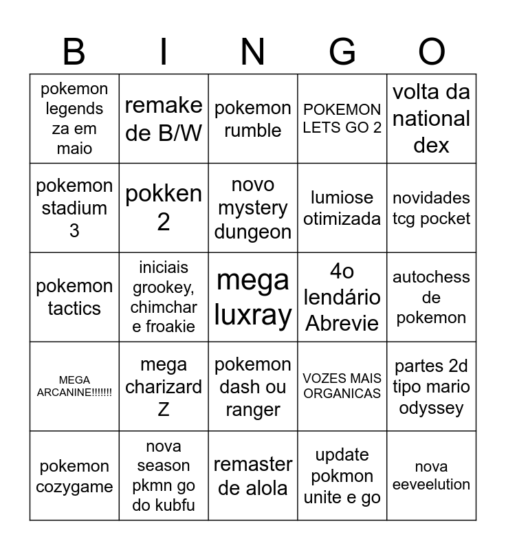 This bingo card has a free space and 24 words: mega charizard Z, nova season pkmn go do kubfu, novo mystery dungeon, pokemon cozygame, volta da national dex, pokemon legends za em maio, pokemon stadium 3, remake de B/W, 4o lendário Abrevie, pokemon dash ou ranger, lumiose otimizada, pokemon tactics, VOZES MAIS ORGANICAS, partes 2d tipo mario odyssey, pokken 2, update pokmon unite e go, autochess de pokemon, pokemon rumble, novidades tcg pocket, iniciais grookey, chimchar e froakie, nova eeveelution, MEGA ARCANINE!!!!!!!, POKEMON LETS GO 2 and remaster de alola.