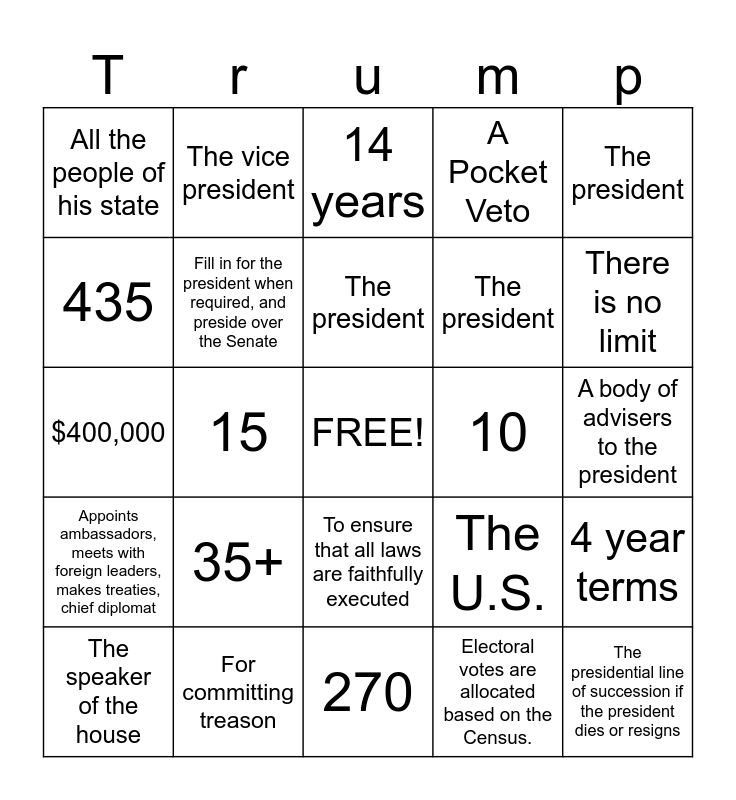 This bingo card has a free space and 24 words: 35+, For committing treason, The president, The speaker of the house, The president, All the people of his state, 435, The vice president, 10, To ensure that all laws are faithfully executed, The president, $400,000, The U.S., 4 year terms, Fill in for the president when required, and preside over the Senate, Electoral votes are allocated based on the Census., A body of advisers to the president, 14 years, There is no limit, 15, The presidential line of succession if the president dies or resigns, Appoints ambassadors, meets with foreign leaders, makes treaties, chief diplomat, A Pocket Veto and 270.