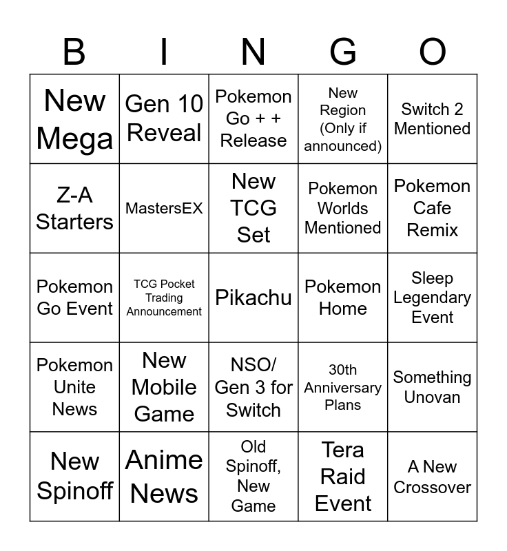 This bingo card has a free space and 24 words: New Mobile Game, Anime News, New TCG Set, New Spinoff, Switch 2 Mentioned, New Mega, Z-A Starters, Gen 10 Reveal, Pokemon Home, NSO/ Gen 3 for Switch, Pokemon Worlds Mentioned, Pokemon Go Event, 30th Anniversary Plans, Something Unovan, MastersEX, Tera Raid Event, Sleep Legendary Event, Pokemon Go + + Release, Pokemon Cafe Remix, TCG Pocket Trading Announcement, A New Crossover, Pokemon Unite News, New Region (Only if announced) and Old Spinoff, New Game.