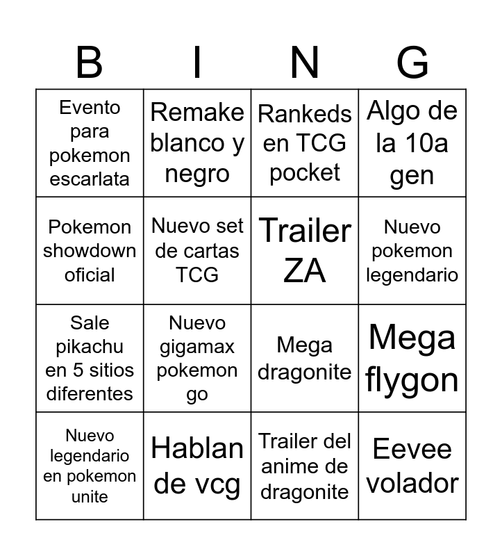 This bingo card has 16 words: Hablan de vcg, Mega flygon, Rankeds en TCG pocket, Evento para pokemon escarlata, Sale pikachu en 5 sitios diferentes, Remake blanco y negro, Mega dragonite, Trailer del anime de dragonite, Pokemon showdown oficial, Nuevo set de cartas TCG, Nuevo legendario en pokemon unite, Algo de la 10a gen, Nuevo gigamax pokemon go, Nuevo pokemon legendario, Trailer ZA and Eevee volador.