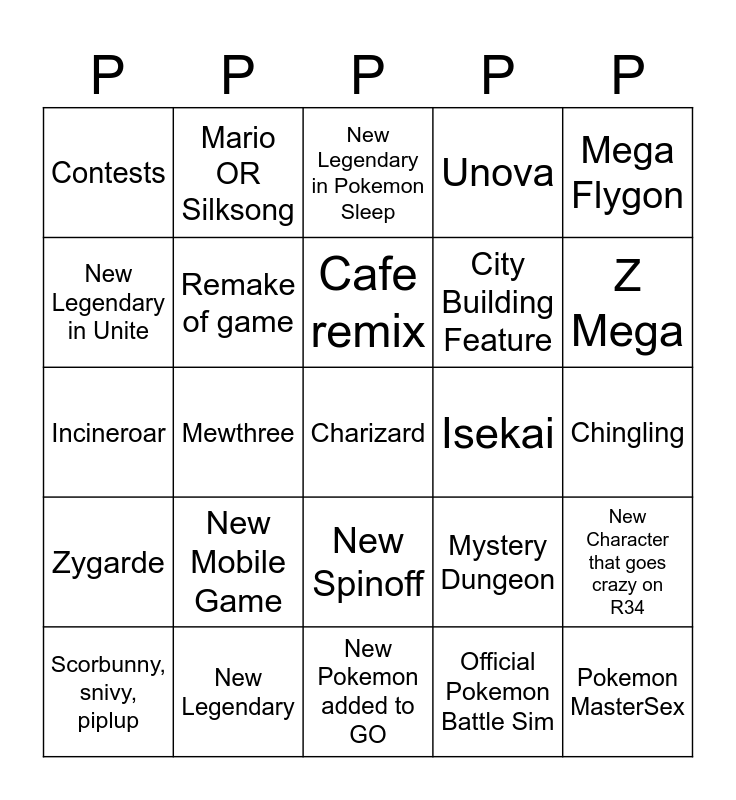 This bingo card has a free space and 24 words: New Mobile Game, New Legendary, Cafe remix, Scorbunny, snivy, piplup, Mega Flygon, Contests, New Legendary in Unite, Mario OR Silksong, Isekai, New Spinoff, City Building Feature, Incineroar, Mystery Dungeon, New Character that goes crazy on R34, Remake of game, Official Pokemon Battle Sim, Chingling, New Legendary in Pokemon Sleep, Z Mega, Mewthree, Pokemon MasterSex, Zygarde, Unova and New Pokemon added to GO.
