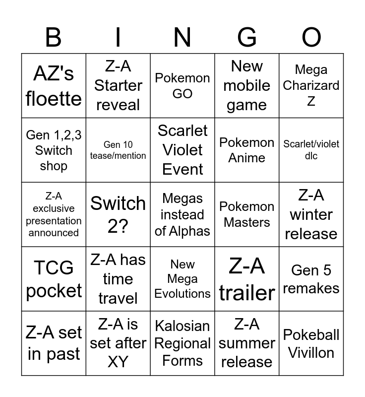 This bingo card has 25 words: Z-A has time travel, Kalosian Regional Forms, Scarlet Violet Event, Z-A set in past, Mega Charizard Z, AZ's floette, Gen 1,2,3 Switch shop, Z-A Starter reveal, Pokemon Masters, New Mega Evolutions, Pokemon Anime, Z-A exclusive presentation announced, Z-A trailer, Gen 5 remakes, Gen 10 tease/mention, Pokeball Vivillon, Z-A winter release, Pokemon GO, Scarlet/violet dlc, Switch 2?, Megas instead of Alphas, Z-A is set after XY, TCG pocket, New mobile game and Z-A summer release.