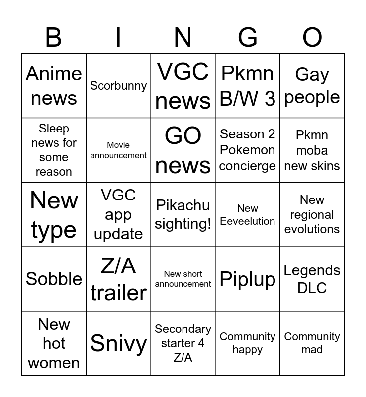 This bingo card has a free space and 24 words: Z/A trailer, Snivy, GO news, New hot women, Gay people, Anime news, Sleep news for some reason, Scorbunny, New Eeveelution, New short announcement, Season 2 Pokemon concierge, New type, Piplup, Legends DLC, Movie announcement, Community happy, New regional evolutions, VGC news, Pkmn moba new skins, VGC app update, Community mad, Sobble, Pkmn B/W 3 and Secondary starter 4 Z/A.