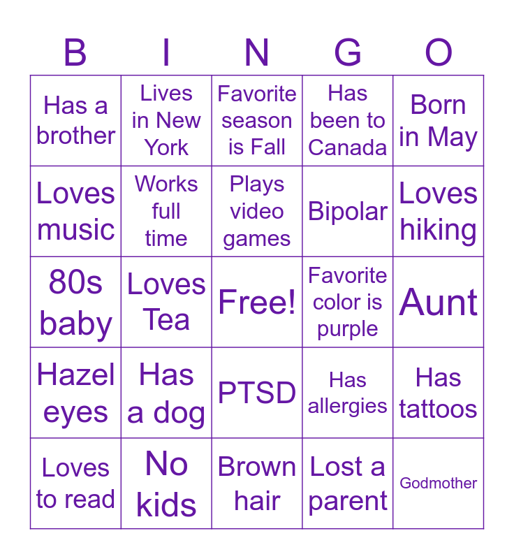 This bingo card has a free space and 24 words: Has a dog, No kids, Plays video games, Loves to read, Born in May, Has a brother, Loves music, Lives in New York, Favorite color is purple, PTSD, Bipolar, 80s baby, Has allergies, Has tattoos, Works full time, Lost a parent, Aunt, Favorite season is Fall, Loves hiking, Loves Tea, Godmother, Hazel eyes, Has been to Canada and Brown hair.