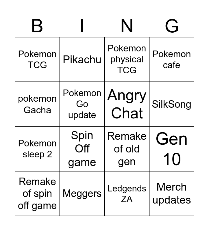 This bingo card has 16 words: Meggers, Gen 10, Pokemon physical TCG, Pokemon TCG, Pokemon sleep 2, Pikachu, Remake of old gen, Ledgends ZA, pokemon Gacha, Pokemon Go update, Remake of spin off game, Pokemon cafe, Spin Off game, SilkSong, Angry Chat and Merch updates.