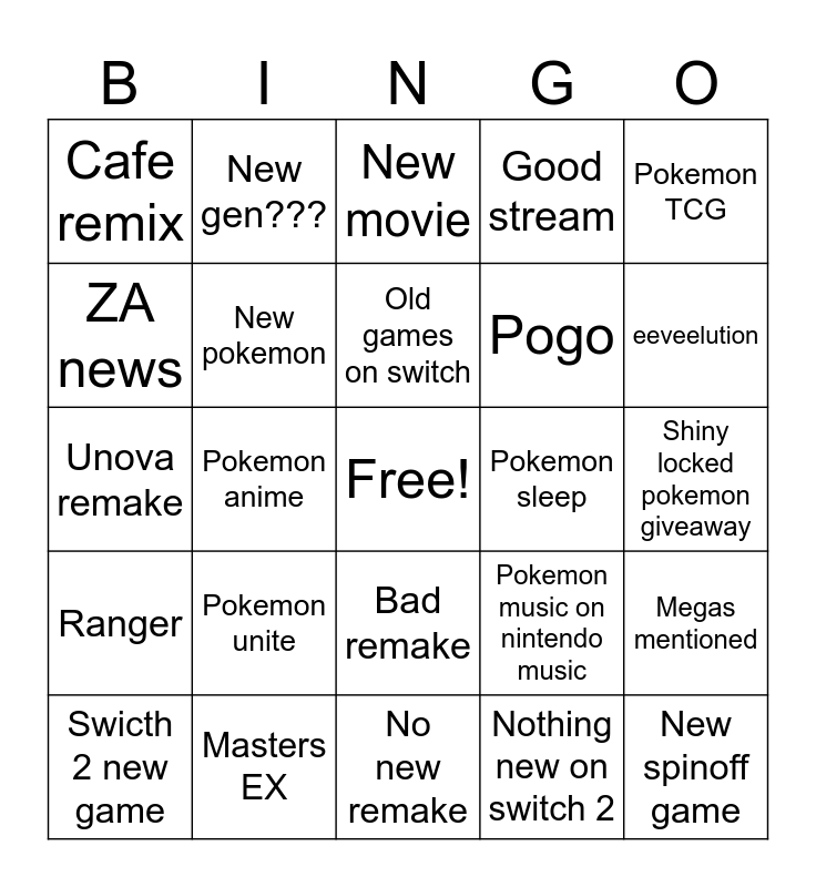 This bingo card has a free space and 24 words: Pokemon unite, Masters EX, Old games on switch, Swicth 2 new game, Pokemon TCG, Cafe remix, ZA news, New gen???, Pokemon sleep, Bad remake, Pogo, Unova remake, Pokemon music on nintendo music, Megas mentioned, New pokemon, Nothing new on switch 2, Shiny locked pokemon giveaway, New movie, eeveelution, Pokemon anime, New spinoff game, Ranger, Good stream and No new remake.