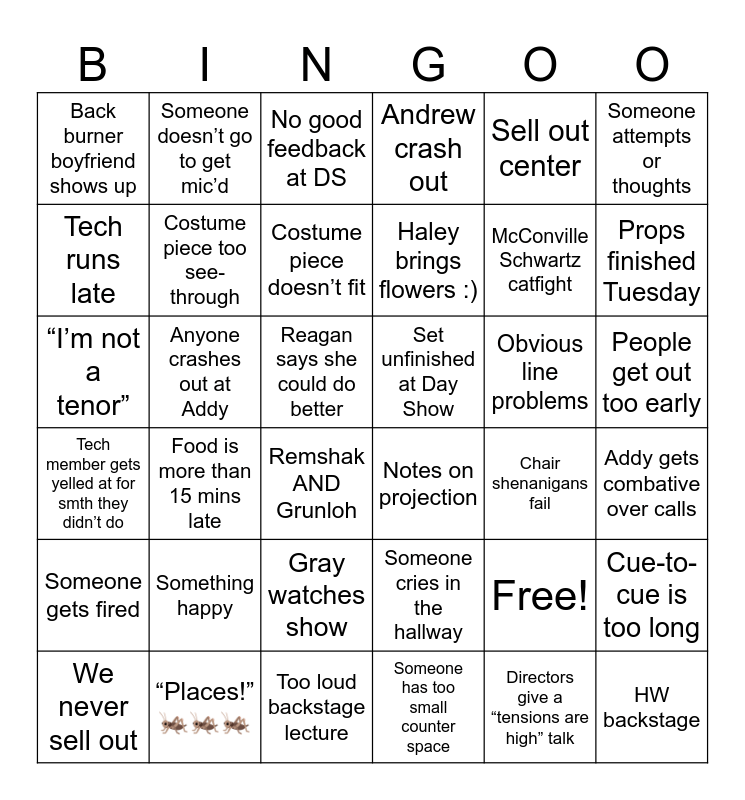 This bingo card has 37 words: Free!, Someone cries in the hallway, Directors give a “tensions are high” talk, Tech runs late, Food is more than 15 mins late, Obvious line problems, Costume piece too see-through, Someone has too small counter space, Sell out center, We never sell out, Props finished Tuesday, Andrew crash out, “I’m not a tenor”, Reagan says she could do better, Someone attempts or thoughts, Set unfinished at Day Show, Something happy, No good feedback at DS, People get out too early, Anyone crashes out at Addy, Back burner boyfriend shows up, Haley brings flowers :), Remshak AND Grunloh, Chair shenanigans fail, “Places!” 🦗🦗🦗, Addy gets combative over calls, Someone doesn’t go to get mic’d, Too loud backstage lecture, Cue-to-cue is too long, Gray watches show, Missing crew member, Notes on projection, McConville Schwartz catfight, Someone gets fired, Tech member gets yelled at for smth they didn’t do, Costume piece doesn’t fit and HW backstage.