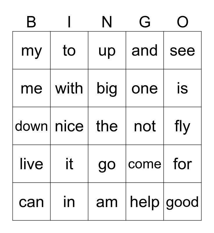 This bingo card has a free space and 24 words: it, in, big, can, see, my, me, to, not, go, one, down, come, for, with, help, fly, up, is, nice, good, live, and and am.