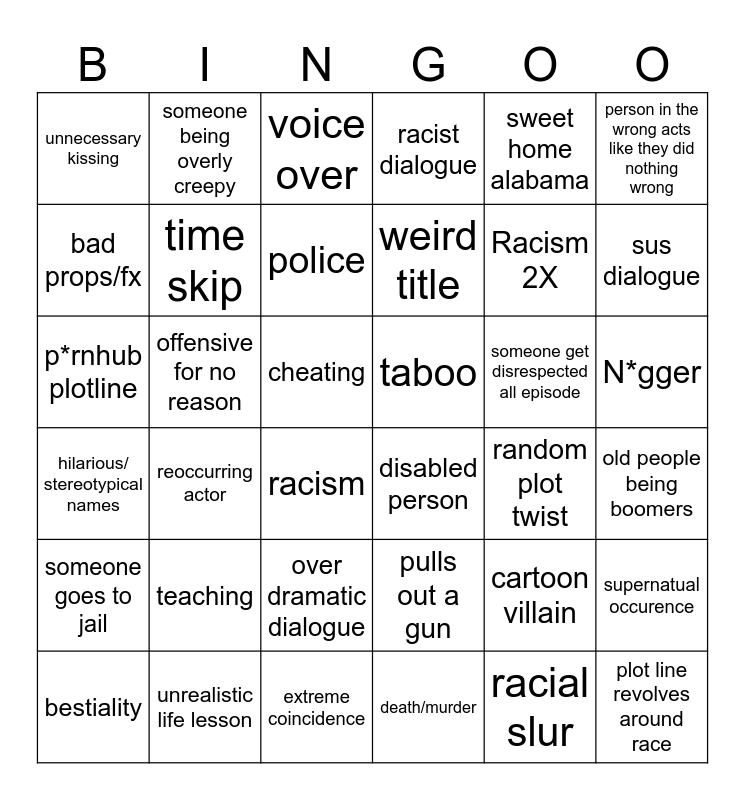 This bingo card has 36 words: pulls out a gun, over dramatic dialogue, death/murder, bad props/fx, hilarious/ stereotypical names, taboo, time skip, extreme coincidence, sweet home alabama, cartoon villain, sus dialogue, racist dialogue, supernatual occurence, offensive for no reason, weird title, unnecessary kissing, someone goes to jail, someone get disrespected all episode, p*rnhub plotline, voice over, cheating, reoccurring actor, disabled person, racism, random plot twist, someone being overly creepy, Racism 2X, unrealistic life lesson, police, person in the wrong acts like they did nothing wrong, plot line revolves around race, bestiality, old people being boomers, N*gger, teaching and racial slur.