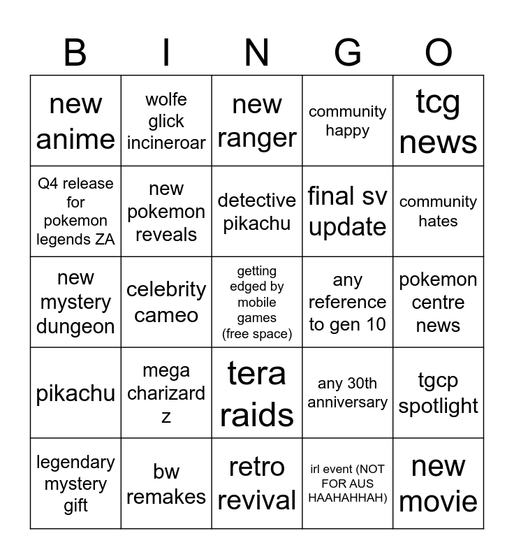 This bingo card has a free space and 24 words: mega charizard z, bw remakes, detective pikachu, legendary mystery gift, tcg news, new anime, Q4 release for pokemon legends ZA, wolfe glick incineroar, any reference to gen 10, tera raids, final sv update, new mystery dungeon, any 30th anniversary, tgcp spotlight, new pokemon reveals, irl event (NOT FOR AUS HAAHAHHAH), pokemon centre news, new ranger, community hates, celebrity cameo, new movie, pikachu, community happy and retro revival.