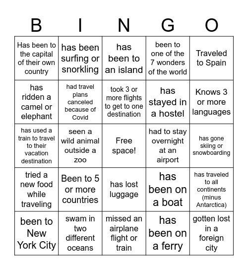 This bingo card has a free space and 24 words: Been to 5 or more countries, swam in two different oceans, took 3 or more flights to get to one destination, been to New York City, Traveled to Spain, Has been to the capital of their own country, has ridden a camel or elephant, has been surfing or snorkling, had to stay overnight at an airport, has lost luggage, has stayed in a hostel, has used a train to travel to their vacation destination, has been on a boat, has traveled to all continents (minus Antarctica), had travel plans canceled because of Covid, has been on a ferry, has gone skiing or snowboarding, has been to an island, Knows 3 or more languages, seen a wild animal outside a zoo, gotten lost in a foreign city, tried a new food while traveling, been to one of the 7 wonders of the world and missed an airplane flight or train.