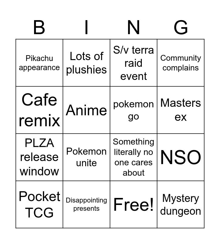 This bingo card has 17 words: Free!, Pocket TCG, S/v terra raid event, Pikachu appearance, Pokemon unite, Community complains, NSO, pokemon go, Masters ex, Anime, Disappointing presents, Something literally no one cares about, Cafe remix, Lots of plushies, PLZA release window, Starters and Mystery dungeon.