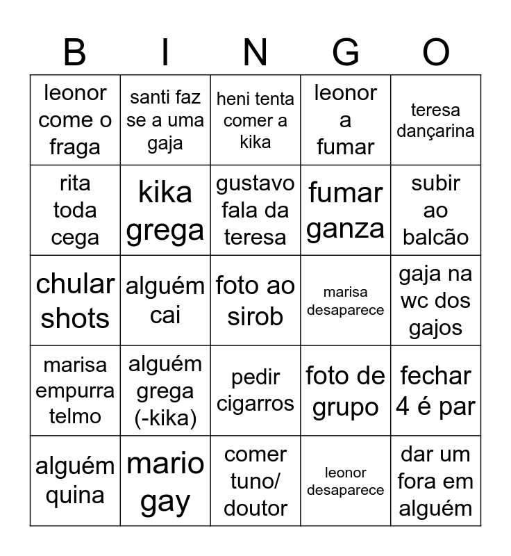This bingo card has 35 words: kika come o mario, kika discute com o mario, kika chora, kika grega, pedir cigarros, leonor a fumar, rita toda cega, david procura comes, gustavo fala da teresa, roubar!, chular shots, teresa dançarina, comes, kika come uma gaja, leonor come o fraga, marisa desaparece, leonor desaparece, alguém cai, marisa empurra telmo, foto ao sirob, foto de grupo, alguém quina, fechar 4 é par, mario gay, heni tenta comer a kika, subir ao balcão, dar um fora em alguém, porrada, fumar ganza, gaja na wc dos gajos, dormir na feup, comer tuno/ doutor, alguém grega (-kika), santi faz se a uma gaja and falar com desconhecidos.