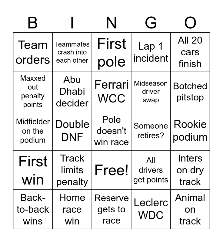 This bingo card has 26 words: Free!, Leclerc WDC, Ferrari WCC, Home race win, All 20 cars finish, Team orders, Maxxed out penalty points, Teammates crash into each other, Rookie podium, All drivers get points, Midseason driver swap, Midfielder on the podium, Inters on dry track, Back-to-back wins, Double DNF, Lestappen 1-2, Lap 1 incident, First win, First pole, Pole doesn't win race, Botched pitstop, Reserve gets to race, Someone retires?, Track limits penalty, Abu Dhabi decider and Animal on track.