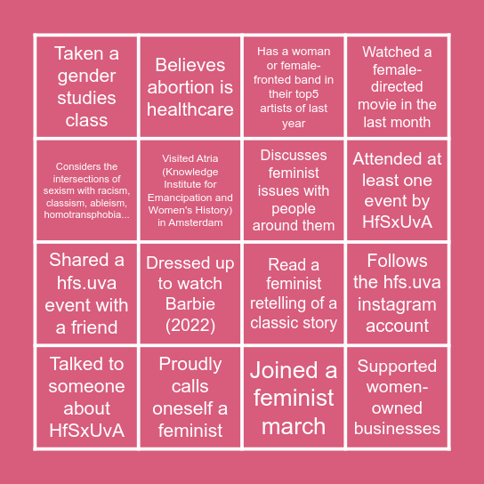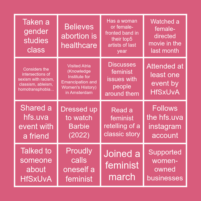 This bingo card has 16 words: Proudly calls oneself a feminist, Follows the hfs.uva instagram account, Has a woman or female-fronted band in their top5 artists of last year, Taken a gender studies class, Shared a hfs.uva event with a friend, Believes abortion is healthcare, Read a feminist retelling of a classic story, Joined a feminist march, Considers the intersections of sexism with racism, classism, ableism, homotransphobia..., Visited Atria (Knowledge Institute for Emancipation and Women's History) in Amsterdam, Talked to someone about HfSxUvA, Watched a female-directed movie in the last month, Dressed up to watch Barbie (2022), Attended at least one event by HfSxUvA, Discusses feminist issues with people around them and Supported women-owned businesses.
