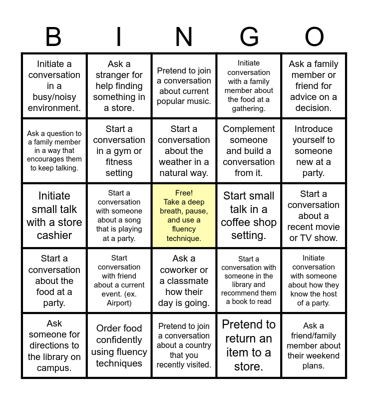 This bingo card has a free space and 24 words: Start conversation with friend about a current event. (ex. Airport), Order food confidently using fluency techniques, Start a conversation about the weather in a natural way., Ask someone for directions to the library on campus., Ask a family member or friend for advice on a decision., Initiate a conversation in a busy/noisy environment., Ask a question to a family member in a way that encourages them to keep talking., Ask a stranger for help finding something in a store., Start small talk in a coffee shop setting., Ask a coworker or a classmate how their day is going., Complement someone and build a conversation from it., Initiate small talk with a store cashier, Start a conversation with someone in the library and recommend them a book to read, Initiate conversation with someone about how they know the host of a party., Start a conversation in a gym or fitness setting, Pretend to return an item to a store., Start a conversation about a recent movie or TV show., Pretend to join a conversation about current popular music., Introduce yourself to someone new at a party., Start a conversation with someone about a song that is playing at a party., Ask a friend/family member about their weekend plans., Start a conversation about the food at a party., Initiate conversation with a family member about the food at a gathering. and Pretend to join a conversation about a country that you recently visited..