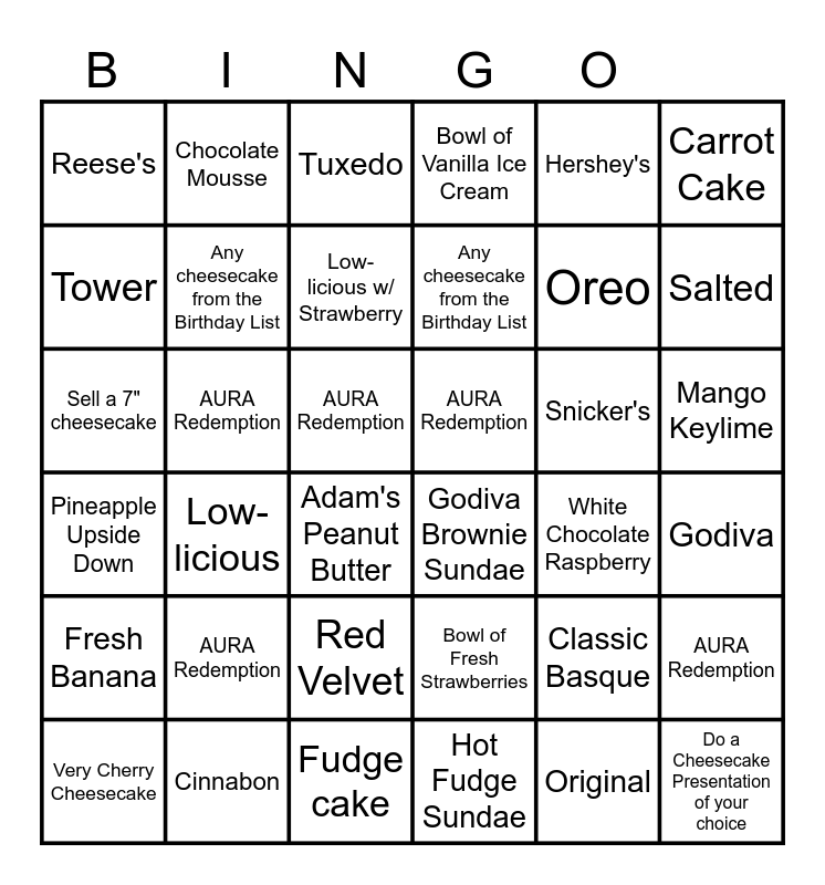 This bingo card has 42 words: Original, Any cheesecake from the Birthday List, AURA Redemption, Snicker's, Godiva, Low-licious, Sell a 7" cheesecake, Fresh Strawberry Cheesecake, Tuxedo, Mango Keylime, AURA Redemption, Any cheesecake from the Birthday List, Salted, Hershey's, Cinnabon, Pineapple Upside Down, AURA Redemption, Oreo, Do a Cheesecake Presentation of your choice, Chocolate Mousse, Carrot Cake, Red Velvet, Fresh Banana, Reese's, Keylime, Very Cherry Cheesecake, Low-licious w/ Strawberry, Cookie Dough, AURA Redemption, Classic Basque, Coconut Cream Pie, AURA Redemption, Tower, White Chocolate Raspberry, Fudge cake, Adam's Peanut Butter, Godiva Brownie Sundae, AURA Redemption, Bowl of Fresh Strawberries, Hot Fudge Sundae, Bowl of Vanilla Ice Cream and AURA Redemption.