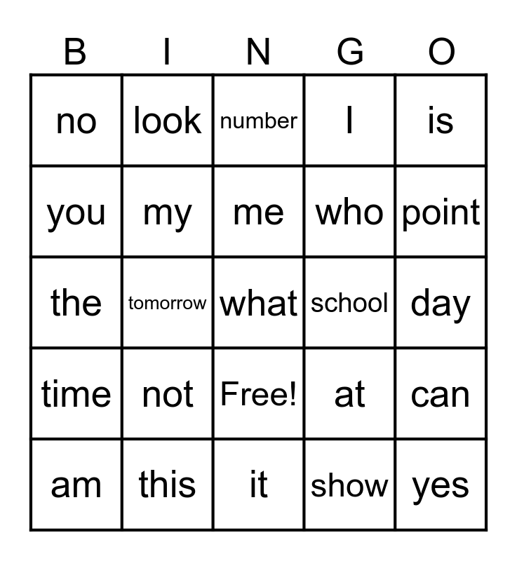 This bingo card has 26 words: Free!, am, my, name, I, is, you, look, me, show, point, the, this, it, school, yes, no, not, number, at, day, time, tomorrow, what, who and can.