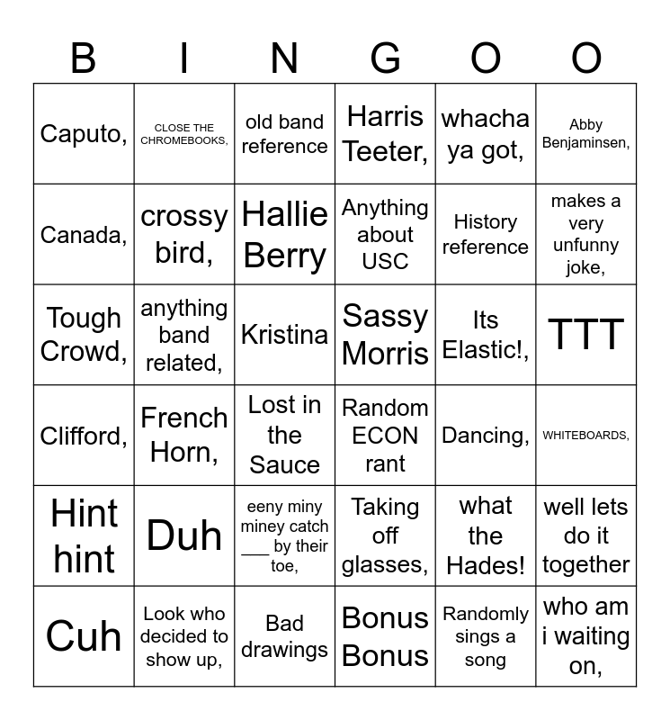 This bingo card has 48 words: Free!, Tough Crowd,, Anything making fun of Russel/Faith,, Dancing,, Its Elastic!,, Taking off glasses,, CLOSE THE CHROMEBOOKS,, _____ my old pal/friend!,, Abby Benjaminsen,, Look who decided to show up,, Canada,, Harris Teeter,, French Horn,, Clifford,, who am i waiting on,, eeny miny miney catch ___ by their toe,, crossy bird,, anything band related,, staring off into the horizon,, whacha ya got,, makes a very unfunny joke,, WHITEBOARDS,, Caputo,, Hallie Berry, #10., Anything about USC, Lost in the Sauce, Pablo the backyardagain, TTT, Sassy Morris, Got a need, a need for Steed, Duh, Randomly sings a song, As the kids say, Random ECON rant, Bad drawings, Bonus Bonus, Kristina, Cuh, Large and in charge, what the Hades!, Hint hint, old band reference, Not today Satan, History reference, Alvin and the chipmunks, well lets do it together and fake crying.