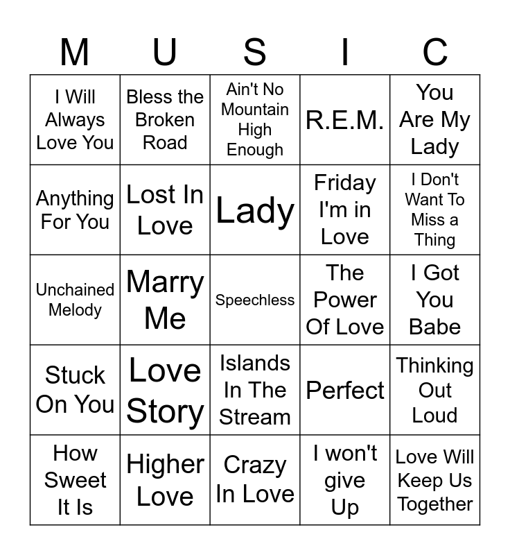 This bingo card has a free space and 51 words: You Make My Dreams Come True, Love Will Keep Us Together, To Make You Feel My Love, Crazy In Love, Love Story, Wind Beneath My Wings, Bless the Broken Road, I'm Yours, Anything For You, Right Here Waiting, Lost In Love, R.E.M., Thinking Out Loud, Perfect, All of Me, Hard Habit to Break, Lady, The Power Of Love, I'd Still Say Yes, You Are My Lady, Marry Me, I won't give Up, I Will Always Love You, Friday I'm in Love, Three Times a Lady, Honey Bee, I Don't Want To Miss a Thing, In Case You Didn't Know, How Sweet It Is, Ain't No Mountain High Enough, Can't Fight This Feeling, Waiting For a Girl Like You, Pretty Woman, Up Where We Belong, I Will Wait, Higher Love, Always On My Mind, When A Man Loves A Woman, Endless Love, Hard To Say I'm Sorry, I Got You Babe, Stuck On You, The Next Time I Fall, You Are So Beautiful, Kiss, Love Me Tender, Unchained Melody, I Just Called To Say I Love You, Kiss From a Rose, Islands In The Stream and I Got You Babe.