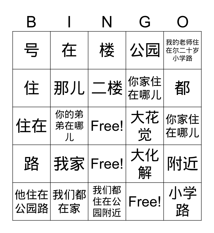 This bingo card has a free space and 24 words: 我家, 我们都在家, 二楼, 他住在公园路, 我的老师住在尔二十岁小学路, 号, 住, 在, 大花觉, Free!, 你家住在哪儿, 住在, 大化解, 附近, 那儿, Free!, 你家住在哪儿, 楼, 都, 你的弟弟在哪儿, 小学路, 路, 公园 and 我们都住在公园附近.