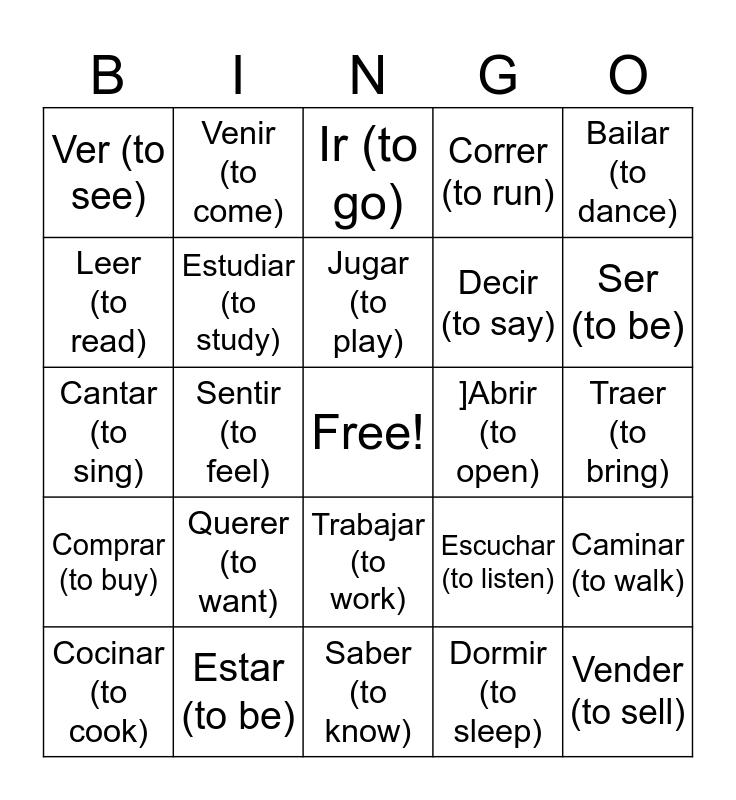 This bingo card has a free space and 35 words: Hablar (to talk), Comer (to eat), Vivir (to live), Estudiar (to study), Trabajar (to work), Correr (to run), Leer (to read), Escribir (to write), Jugar (to play), Nadar (to swim), Cantar (to sing), Bailar (to dance), Beber (to drink), Viajar (to travel), Ver (to see), ]Abrir (to open), Dormir (to sleep), Sentir (to feel), Comprar (to buy), Vender (to sell), Escuchar (to listen), Cocinar (to cook), Caminar (to walk), Estar (to be), Ir (to go), Ser (to be), Tener (to have), Hacer (to do), Decir (to say), Traer (to bring), Poner (to put), Saber (to know), Querer (to want), Venir (to come) and Conocer (to know people/places).