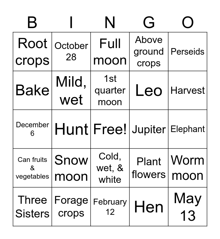 This bingo card has a free space and 29 words: Three Sisters, Largemouth bass, Hunt, prune trees, Root crops, Full moon, Mild, wet, Snow moon, Jupiter, Forage crops, Elephant, May 13, February 12, Hen, Harvest, Pisces, Cold, wet, & white, Can fruits & vegetables, Perseids, December 6, Plant flowers, Strawberry moon, Leo, Bake, Above ground crops, October 28, Worm moon, 1st quarter moon and Thanksgiving.