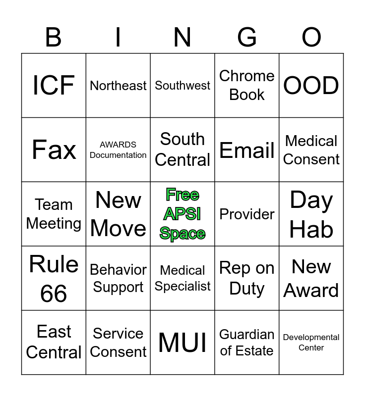 This bingo card has a free space and 34 words: Guardian of Person, Guardian of Estate, Payee, Family, Rule 66, AWARDS Documentation, OOD, East Central, Northeast, Northwest, South Central, Southwest, Central Office, County Board/ DD, Provider, Medical Consent, Service Consent, Team Meeting, Behavior Support, Rep on Duty, Medical Specialist, IO Waiver, ICF, Day Hab, MUI, Developmental Center, Chrome Book, Outlook Calendar, Email, Fax, Trust, New Move, New Award and Technical Assistance.