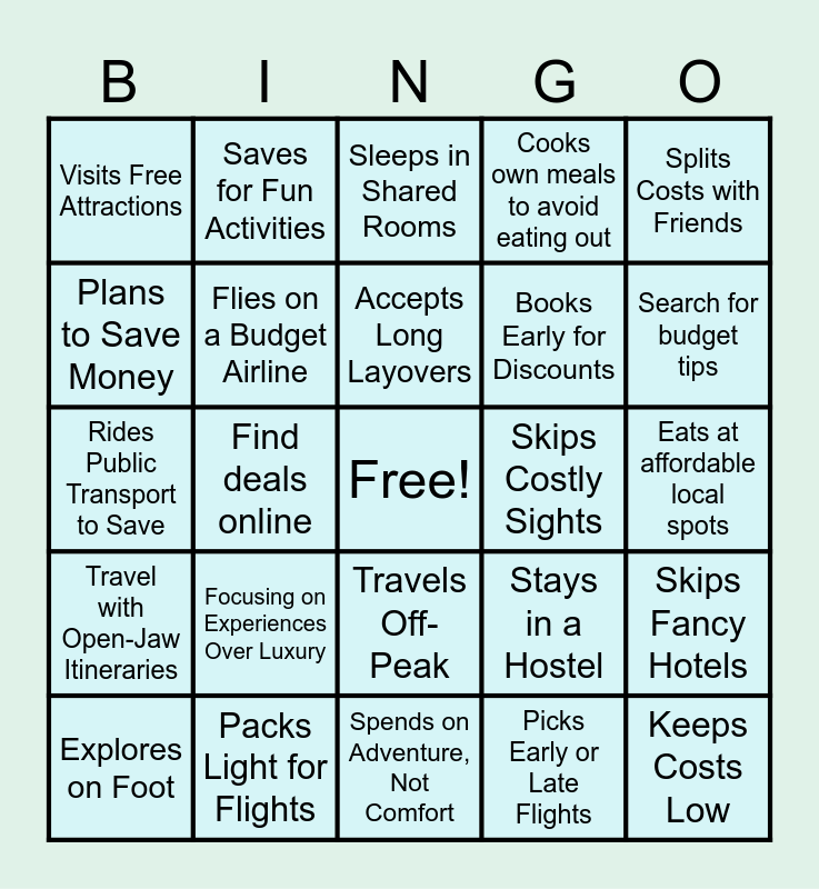 This bingo card has a free space and 24 words: Focusing on Experiences Over Luxury, Packs Light for Flights, Accepts Long Layovers, Explores on Foot, Splits Costs with Friends, Visits Free Attractions, Plans to Save Money, Saves for Fun Activities, Skips Costly Sights, Travels Off-Peak, Books Early for Discounts, Rides Public Transport to Save, Stays in a Hostel, Skips Fancy Hotels, Flies on a Budget Airline, Picks Early or Late Flights, Eats at affordable local spots, Sleeps in Shared Rooms, Search for budget tips, Find deals online, Keeps Costs Low, Travel with Open-Jaw Itineraries, Cooks own meals to avoid eating out and Spends on Adventure, Not Comfort.