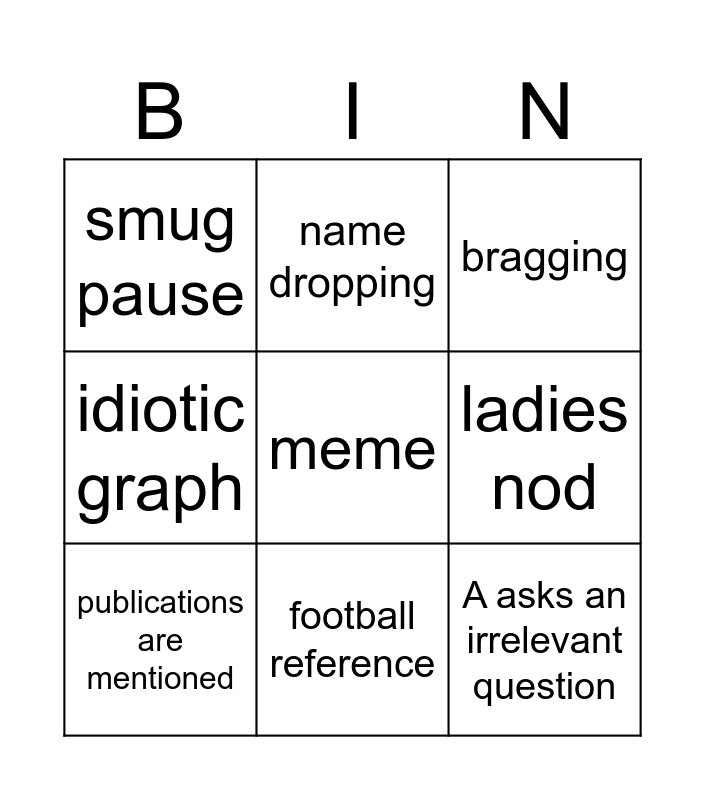 This bingo card has a free space and 8 words: ladies nod, bragging, name dropping, publications are mentioned, smug pause, A asks an irrelevant question, idiotic graph and football reference.