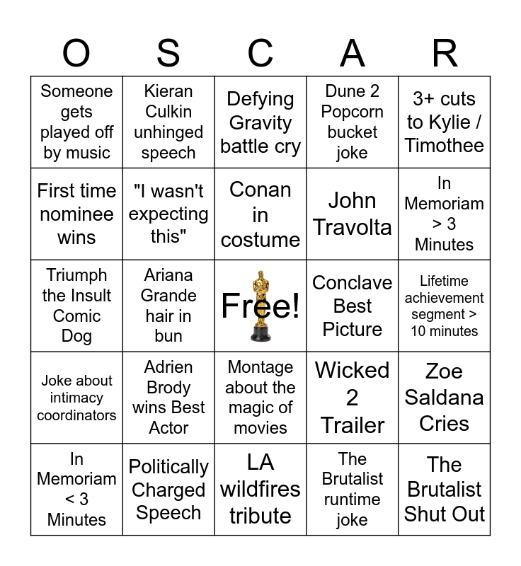 This bingo card has a free space and 44 words: Emilia Perez Roast, The Brutalist Shut Out, Anora Sweep (BP, Director, Screenplay, Actress), In Memoriam < 3 Minutes, "Holding Space" Joke", The Brutalist runtime joke, Defying Gravity battle cry, Someone thanks God, 3+ cuts to Kylie / Timothee, Politically Charged Speech, Dune 2 Popcorn bucket joke, Conclave Best Picture, Montage about the magic of movies, Adrien Brody wins Best Actor, Speech read from phone, LA wildfires tribute, Someone brings their mom, Triumph the Insult Comic Dog, DEI Joke, In Memoriam > 3 Minutes, Kieran Culkin unhinged speech, Timothee wins best actor, Wicked performance includes song from Part 2, Someone gets played off by music, Spoof musical number, Lifetime achievement segment > 10 minutes, Nosferatu Joke, The Substance / ozempic joke, Wicked 2 Trailer, Joke about intimacy coordinators, Show runs more than 3 hours, Zoe Saldana Cries, Someone curses, Jaws anniversary tribute, Ariana Grande hair in bun, Diane Warren loses Original Song, Kylie / Timothee red carpet debut, "I didn't write a speech", Conan in costume, First time nominee wins, John Travolta, Demi Moore wins Best Actress, "I wasn't expecting this" and Conan bit in audience.