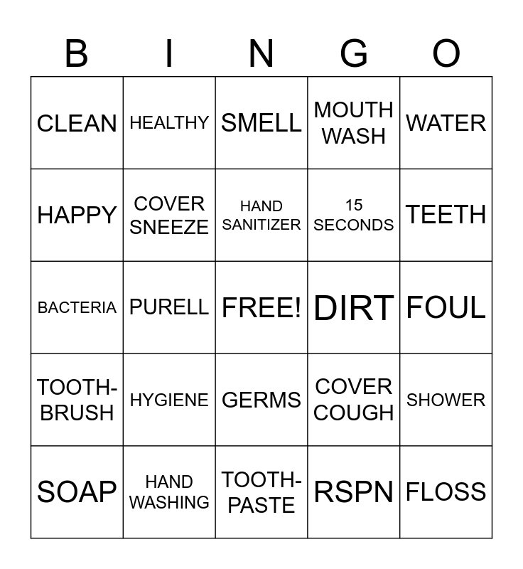 This bingo card has a free space and 24 words: HYGIENE, HAND WASHING, HAND SANITIZER, SOAP, WATER, CLEAN, HAPPY, HEALTHY, DIRT, GERMS, 15 SECONDS, BACTERIA, COVER COUGH, SHOWER, COVER SNEEZE, RSPN, FOUL, SMELL, TEETH, PURELL, FLOSS, TOOTH-BRUSH, MOUTH WASH and TOOTH-PASTE.