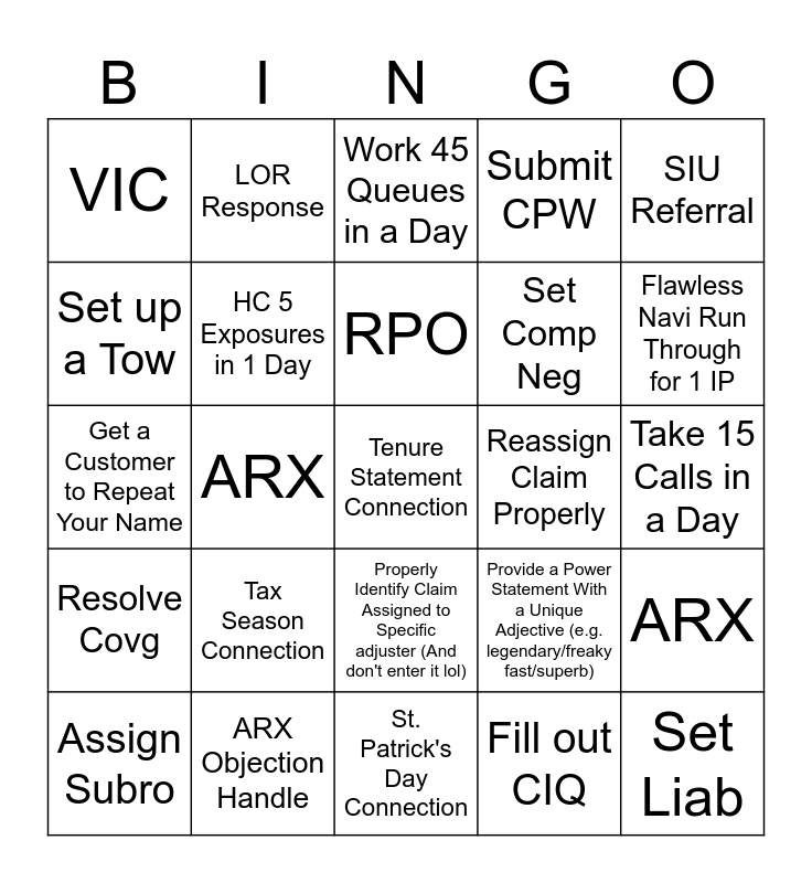 This bingo card has a free space and 24 words: Tax Season Connection, ARX Objection Handle, RPO, Assign Subro, SIU Referral, VIC, Set up a Tow, LOR Response, Reassign Claim Properly, Properly Identify Claim Assigned to Specific adjuster (And don't enter it lol), Set Comp Neg, Get a Customer to Repeat Your Name, Provide a Power Statement With a Unique Adjective (e.g. legendary/freaky fast/superb), ARX, HC 5 Exposures in 1 Day, Fill out CIQ, Take 15 Calls in a Day, Work 45 Queues in a Day, Flawless Navi Run Through for 1 IP, ARX, Set Liab, Resolve Covg, Submit CPW and St. Patrick's Day Connection.